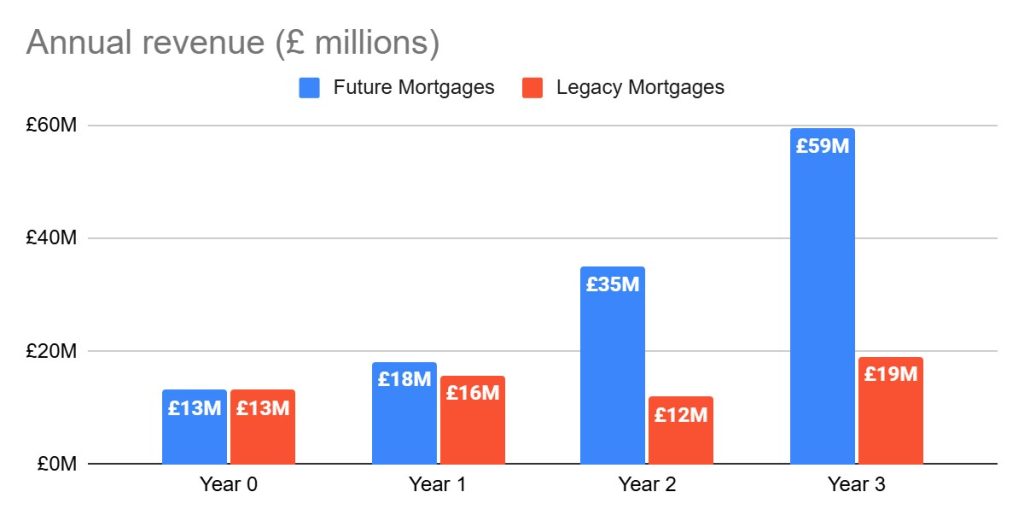 Futureโs revenue has nearly doubled from ยฃ18M to ยฃ35M. Gross margins have barely dropped from 38% to 37%, despite the rise in lead costs and the drop in average transaction values due to Sonnyโs high-risk, high-leverage decision to drop the arrangement fee. Further economies of scale and ongoing increases in AI-enabled productivity have more than doubled earnings, leaving shareholders with a ยฃ6.8M profit after tax – more than 7x the profit the year before Sonny took the reins.